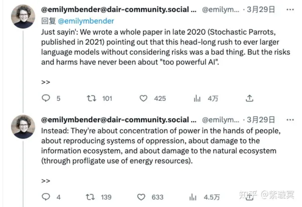华盛顿大学语言学系教授、公开信中引用的第一篇论文的共同作者 Emily M. Bender 在推特上表示,这封公开信掺杂了“Aihype”(AI炒作),她也认为问题的症结,不是AI本身,而是更要提防AI背后的人和权力体系,Bender 反驳说:“我们在 2020 年底写了一篇论文《随机鹦鹉》(2021年发表),指出这种不考虑风险就一头扎进越来越大的语言模型的做法是一件坏事。但风险和危害从来都不是关于‘太强大的人工智能’本身,相反,它们是关于权力集中在人的手中,关于压迫制度的再现,关于对信息生态系统的损害,以及关于对自然生态系统的损害(通过对能源资源的暴殄天物)。”