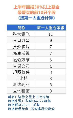 AI在A股热得发烫,与之有关的基金也是一夕成名。根据统计,在全市场有可比数据的1.03万款主代码基金当中,有116款基金上半年的回报率超过30%,其中除去纯债基等品种之外,不少基金都有披露十大重仓数据。按一季度数据计算,这116款基金涉及的第一大重仓股共有36只,其中前10的个股都被至少3只基金列为第一大重仓,它们几乎都与AI有着紧密关联。