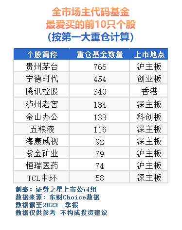 根据统计,将第一大重仓股的统计范围扩展到全市场后,有6支个股的重仓基金家数超过100家,其中贵州茅台甚至超过700家。如果取全市场排名前十个股可以发现,只有两家算是严格意义上的AI概念股,其中有一个还是港股腾讯控股。
